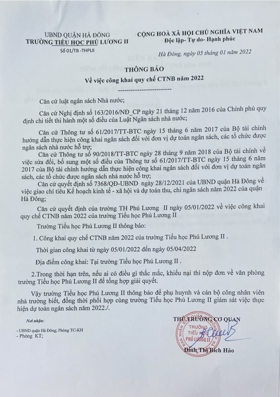 Thông báo về việc công khai quy chế CTNB năm 2022